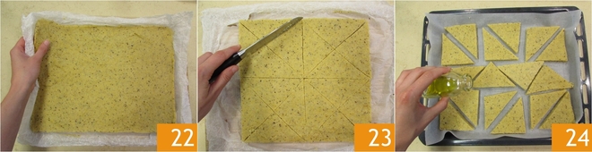 Holen Sie die abgekühlte Polenta, schneiden Sie die Ränder ab und schneiden Sie die Polenta in 4 große Quadrate, aus denen Sie dann durch diagonales Schneiden 16 Dreiecke erhalten 23. Legen Sie sie auf ein Backblech, beträufeln Sie sie mit etwas Öl und Salz und backen Sie sie 30 Minuten im statischen Ofen bei 200°C 24.