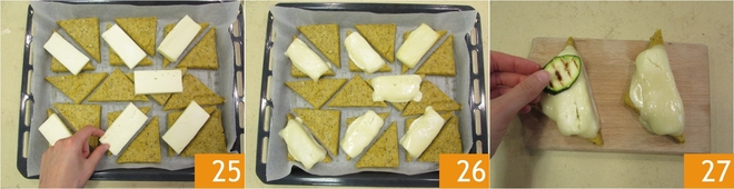 Nehmen Sie die Polenta aus dem Ofen und bedecken Sie 8 Scheiben mit dem geschnittenen Taleggio DOP 25. Backen Sie sie im statischen Ofen bei 200°C für 2 Minuten 26. Füllen Sie die Dreiecke mit dem gegrillten Gemüse 27 und den karamellisierten Zwiebeln.