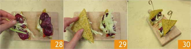 Zum Schluss legen Sie auch den in Julienne geschnittenen Salat darauf 28. Schließen Sie mit einer weiteren Scheibe Polenta 29 und befestigen Sie sie mit einem Holzstäbchen. Genießen Sie den Polenta-Sandwich mit Gemüse und Taleggio warm oder heiß 30.