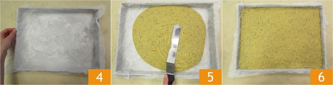 Legen Sie ein mit Backpapier ausgelegtes Backblech von 30x40 cm 4 aus, gießen Sie die Polenta darauf und glätten Sie sie mit einem Spatel 5 6.