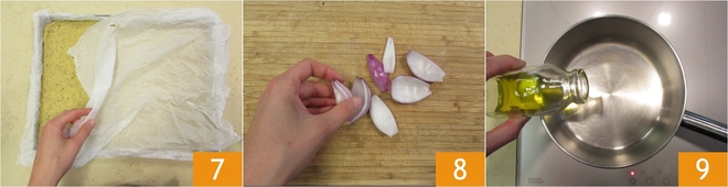 Bedecken Sie sie mit einem weiteren Blatt 7 und lassen Sie sie dann im Kühlschrank vollständig abkühlen, mindestens 1 Stunde. Schälen Sie die Zwiebeln und schneiden Sie sie in Spalten 8. Erhitzen Sie in einem Topf mit dickem Boden etwas Öl 9.