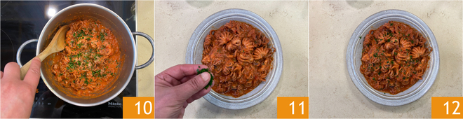 Den Deckel aufsetzen und 40 Minuten bei mittlerer Hitze kochen lassen 7. In der Zwischenzeit die zurückgelegten Petersilienblätter hacken 8. Nach dieser Zeit salzen, pfeffern und mit der Petersilie würzen, wobei etwas für das Anrichten zurückgehalten wird 9.
