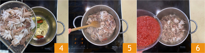 Fügen Sie die Polipetti hinzu 4 und braten Sie sie unter häufigem Rühren an, bis das Wasser verdampft ist und die Polipetti ihre Farbe geändert haben 5. An diesem Punkt die zuvor zerdrückten geschälten Tomaten hinzufügen 6.