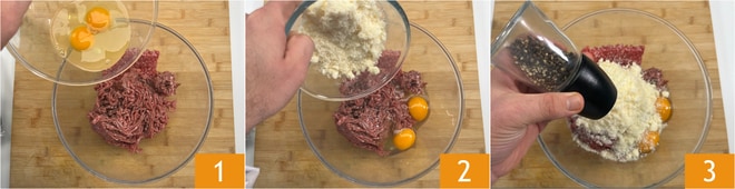 Um die Frikadellen in der Heißluftfritteuse zuzubereiten, geben Sie das Schweine- und Rinderhackfleisch in eine Schüssel, dann fügen Sie die Eier hinzu 1, den geriebenen Parmigiano Reggiano 2, Salz und Pfeffer 3.