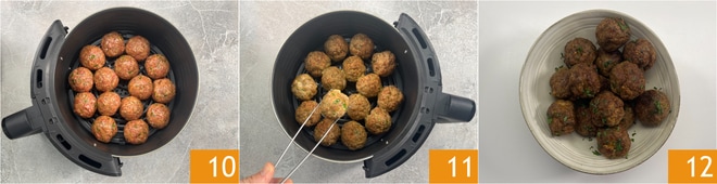 Legen Sie die Frikadellen in den Korb der Heißluftfritteuse (wir haben eine Fritteuse mit einem Fassungsvermögen von 6 Litern verwendet) 10 und garen Sie sie bei 200 °C für 20 Minuten, indem Sie sie gelegentlich wenden, um eine gleichmäßige Garung zu gewährleisten 11. Ihre Frikadellen in der Heißluftfritteuse sind bereit zum Genießen 12!