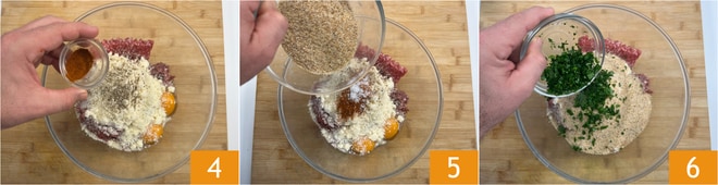 Fügen Sie auch das süße Paprikapulver 4, die Semmelbrösel 5 und die gehackte Petersilie 6 hinzu.