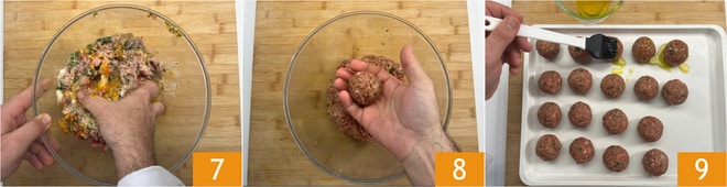 Vermischen Sie die Zutaten 7, bis Sie eine homogene Masse erhalten. Decken Sie die Schüssel mit Folie ab und lassen Sie sie 30 Minuten im Kühlschrank ruhen. Nach dieser Zeit nehmen Sie 50 g der Mischung mit feuchten Händen und formen Sie zu einer runden Form 8. Platzieren Sie die Bällchen nach und nach auf einem Tablett und bestreichen Sie sie gründlich mit Öl 9.