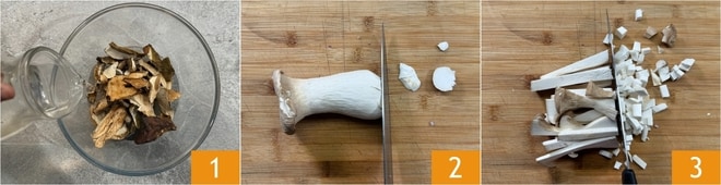 Um den Pilzbraten zuzubereiten, legen Sie zuerst die Steinpilze für 15 Minuten in kaltes Wasser ein 1. In der Zwischenzeit die Pilze putzen: die erdige Basis des Stiels entfernen 2 und mit einem feuchten Tuch abreiben, dann in etwa 1 cm große Würfel schneiden 3.