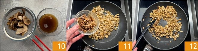 In der Zwischenzeit die getrockneten Steinpilze abtropfen lassen und das Einweichwasser aufbewahren, da es später für die Soße benötigt wird 10. Die Steinpilze grob hacken und in die Pfanne geben 11. Die Pilze weiter anbraten, bis sie gut gebräunt sind; das dauert insgesamt etwa 10-15 Minuten 12.