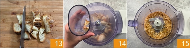 In der Zwischenzeit das Brot in Stücke schneiden 13, in einen Mixer geben 14 und zu Krümeln verarbeiten 15.