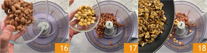 Die Brotkrümel in eine Schüssel geben und in den gleichen Mixer die vorgekochten Bohnen 16, die Haselnüsse 17 und die angebratenen Pilze 18 geben. Die Klingen betätigen, um die Zutaten zu vermischen.