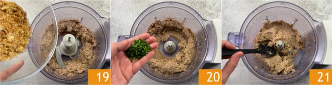 Die Brotkrümel hinzufügen 19 und erneut mixen, bis eine ziemlich homogene Masse entsteht, dann die gehackte Petersilie hinzufügen 20. Mit Salz und Pfeffer abschmecken und gut umrühren 21.