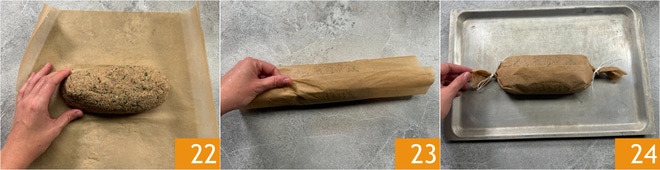 Ein Blatt Backpapier auf der Arbeitsfläche auslegen, die Pilzmischung in der Mitte platzieren und in Form eines Bratens modellieren 22. Das Backpapier um den Braten wickeln 23 und die Enden wie ein Bonbon verschließen 24. Das Paket in eine Auflaufform legen und im vorgeheizten statischen Ofen bei 180° für 30 Minuten backen.