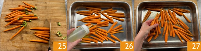 Während der Braten im Ofen ist, kümmern Sie sich um die Beilage: Die Karotten waschen und die Enden abschneiden 25, dann in eine Auflaufform geben und mit Öl 26, Salz und Pfeffer würzen. Mit den Händen mischen, um die Karotten gleichmäßig zu würzen, dann die Form zusammen mit dem Braten in den Ofen geben und 25-30 Minuten backen.