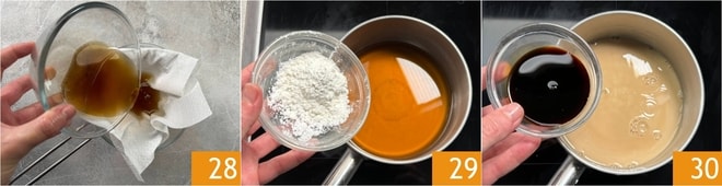 In der Zwischenzeit die Soße zubereiten: Das Einweichwasser der Pilze durch ein Küchentuch filtrieren 28 und 200 g davon in einen kleinen Topf mit Maisstärke 29 und Sojasoße 30 geben.