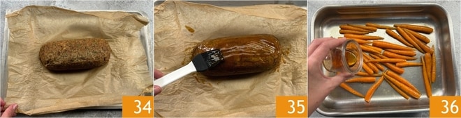 Nach 30 Minuten den Braten aus dem Ofen nehmen und das Paket öffnen 34, dann mit der Pilzsoße bestreichen 35. Den Braten unbedeckt wieder in den Ofen geben und weitere 20 Minuten bei 180° backen. Sobald die Karotten gar sind, auch diese aus dem Ofen nehmen und mit Ahornsirup übergießen 36.