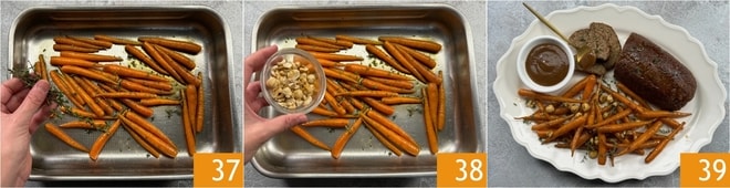 Die Thymianblätter 37 und die grob gehackten Haselnüsse 38 hinzufügen, umrühren und erneut für weitere 5-10 Minuten in den Ofen geben, bis der Braten fertig ist. Lassen Sie den Braten nach dem Herausnehmen einige Minuten ruhen. Schließlich mit Thymian und Pfeffer garnieren und den Pilzbraten in Scheiben geschnitten mit der restlichen Soße servieren 39!