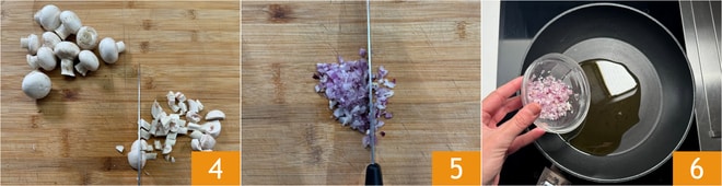 Verfahren Sie genauso mit den Champignons 4. Schließlich die Schalotte schälen und hacken 5. In einer beschichteten Pfanne etwas Öl erhitzen und die Schalotte hinzugeben 6.