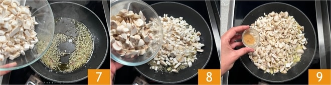Die Schalotte einige Minuten andünsten, dann die Kräuterseitlinge 7 und Champignons hinzufügen 8. Mit Salz, Pfeffer und Ingwer würzen 9. Umrühren und etwa 5 Minuten bei starker Hitze anbraten.