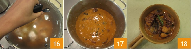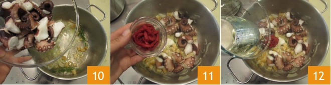 den Oktopus 10 und das Tomatenmark 11. Rühren Sie alles gut um und löschen Sie mit dem Weißwein ab 12.
