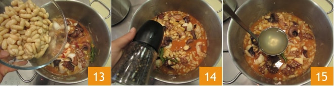 Lassen Sie den Alkohol verdampfen (ein paar Augenblicke), dann können Sie die Bohnen hinzufügen 13 und nach Belieben mit Salz und Pfeffer abschmecken 14. Gießen Sie etwas von dem Kochwasser des Oktopus dazu, um das Kochen fortzusetzen 15.