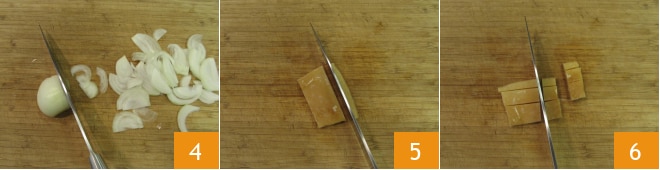 Schälen und schneiden Sie die Zwiebel fein 4 und schneiden Sie dann zuerst die gut gereinigte Kruste von Grana Padano DOP in Streifen von ein paar Zentimetern 5 und schließlich in Würfel 6.