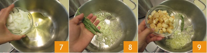 Begeben Sie sich an den Herd und geben Sie die Zwiebel in einen Schuss Öl in einen großen Topf 7. Lassen Sie sie anbraten und würzen Sie mit den Rosmarinzweigen 8. Dann fügen Sie die in Stücke geschnittenen Grana Padano DOP-Kruste hinzu 9,