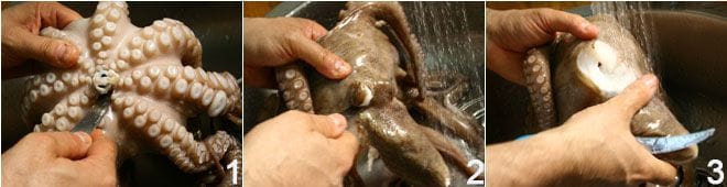 Reinigen Sie den Oktopus unter fließendem Wasser, indem Sie ihn von den Eingeweiden, dem zentralen Zahn 1, den Augen 2 und, soweit möglich, der glitschigen Schicht, die den Oktopus bedeckt, befreien.