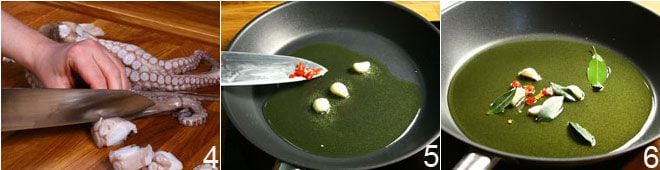 Schneiden Sie nun den Oktopus in Stücke, die maximal so groß wie eine Walnuss sind 4; größere Stücke würden nur die Kochzeit verlängern. In einem Topf das Öl erhitzen und die ganzen Knoblauchzehen anbraten 5, die Lorbeerblätter hinzufügen, die Chilischote in kleine Stücke schneiden 6 und darauf achten, die Samen ganz oder teilweise zu entfernen, falls man keine zu scharfe Speise wünscht.