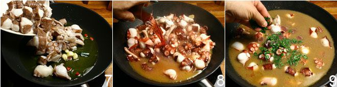 Fügen Sie nun die Oktopusstücke hinzu 7 und lassen Sie sie kurz anbraten, dann fügen Sie den Rotwein hinzu 8, ein bisschen gehackte Petersilie 9, bringen Sie es erneut zum Kochen und reduzieren Sie die Hitze; decken Sie den Topf ab und kochen Sie ihn mindestens 40/50 Minuten, je nach Härte des Oktopus. Sollte die Soße zu sehr eindicken, fügen Sie ein paar Esslöffel Wasser hinzu. Kurz bevor Sie den betrunkenen Oktopus vom Herd nehmen, fügen Sie eine großzügige Handvoll gehackte Petersilie hinzu, würzen Sie mit Salz und lassen Sie ihn ein paar Minuten abkühlen.