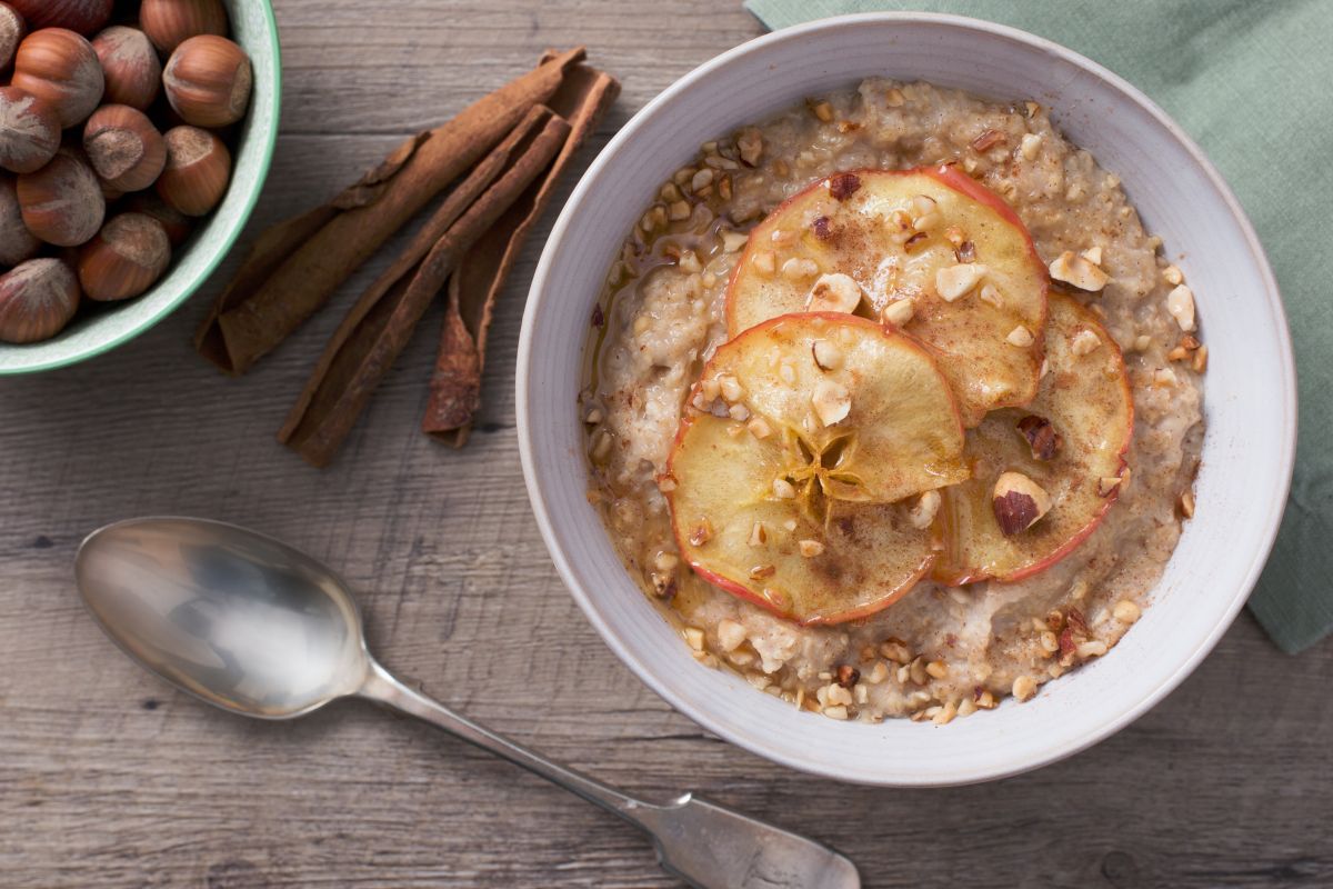 Ein Trend, der seit einigen Jahren in England populär ist und auch in Italien Fuß gefasst hat. Wir sprechen von Porridge, dem berühmten "Haferbrei", der auch von Prominenten geliebt wird, ein komplettes Frühstück der Serie "whole food" am Morgen: alles in einer Schale. Diese Speise, die aus Haferflocken gekocht in Wasser und Milch oder nur in Milch je nach Variante besteht, kann mit frischen Früchten, Trockenfrüchten, Agavensirup oder Marmeladen angereichert werden, ist sehr nahrhaft und komplett. In diesem Rezept bieten wir Ihnen den Porridge mit Äpfeln und Haselnüssen an, ideal, um den Tag mit der richtigen Portion Energie und Süße zu beginnen. Ein echtes reichhaltiges und aromatisches Comfort Food für die kälteren Morgenstunden. Wir sind jedoch sicher, dass es in Ihre morgendliche Routine das ganze Jahr über integriert wird! Entdecken Sie Löffel für Löffel den Porridge mit Äpfeln und Haselnüssen, vielleicht für ein ruhiges Sonntagsfrühstück oder einen Brunch. Probieren Sie ihn auch für einen gehaltvollen Nachmittagssnack in voller Entspannung, den Sie gut warm genießen können! Sind Sie bereit, sich mit Energie zu versorgen? Wenn Sie nicht kochen möchten, haben wir auch die Version des Overnight-Porridge (oder Kalter Porridge) ohne Kochen!