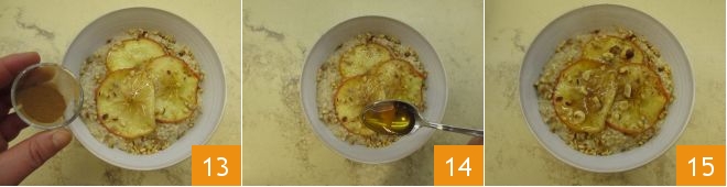 Bestäuben Sie mit einer Prise Zimt 13 und geben Sie einen Teelöffel Honig darüber 14. Nach Belieben können Sie mit weiteren gehackten Haselnüssen dekorieren 15. Ihr Porridge mit Äpfeln und Haselnüssen ist bereit, genossen zu werden!