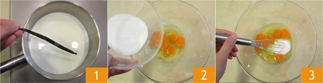 Um die portugiesische Milch vorzubereiten, gießen Sie zuerst die Milch in einen Topf und geben Sie die Vanilleschote hinzu, die Sie zuvor der Länge nach eingeschnitten haben 1. Auf kleiner Flamme zum Sieden bringen. In der Zwischenzeit die Eier, Eigelbe und den Zucker in eine große Schüssel geben 2 und alles mit einem Handbesen vermischen 3.