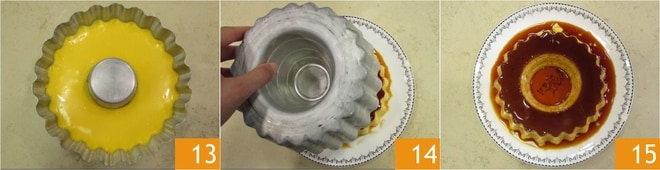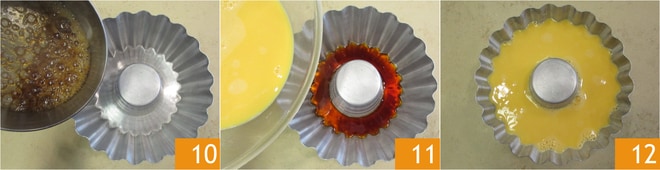 Gießen Sie nun das heiße Karamell in eine Kranzform mit einem oberen Durchmesser von 20 cm, einem unteren von 15 cm und einer Höhe von 8 cm 10. Lassen Sie es ein paar Minuten abkühlen, dann fügen Sie die Eiermischung hinzu 11. Stellen Sie die Form in ein hohes Backblech, das Sie mit einigen Zentimetern Wasser füllen und backen Sie es im vorgeheizten statischen Ofen bei 160°C für etwa 75 Minuten im Wasserbad 12.