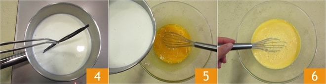 Wenn die Milch heiß ist, entfernen Sie die Vanilleschote 4 und fügen Sie sie der Eiermischung hinzu 5, gut mit dem Schneebesen umrühren 6. Die Mischung beiseite stellen und sich dem Karamell widmen.