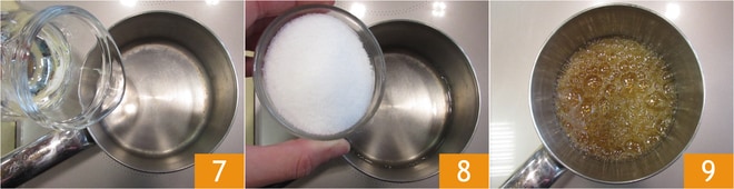 Gießen Sie das Wasser in einen Topf 7, fügen Sie den Zucker hinzu 8 und erhitzen Sie es bei mittlerer Flamme, bis es eine schöne bernsteinfarbene Färbung annimmt 9.