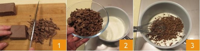 Um die Schokoladen- und Haselnusspralinen herzustellen, hacken Sie die Gianduia-Schokolade 1, erhitzen Sie dann die Sahne in einem kleinen Topf und geben Sie die gehackte Schokolade hinzu 2, rühren Sie mit dem Schneebesen 3, bis sie vollständig geschmolzen ist.