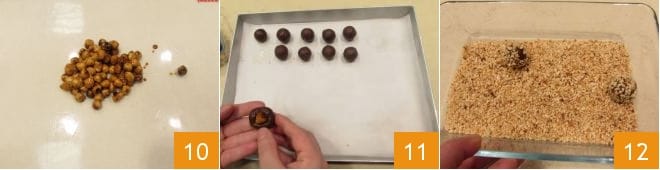 Geben Sie die karamellisierten Haselnüsse auf ein mit Backpapier ausgelegtes Tablett oder eine Silikonmatte 10, trennen Sie die Haselnüsse, um zu verhindern, dass sie beim Abkühlen aneinander haften bleiben. Komponieren Sie nun die Pralinen: Nehmen Sie die fest gewordene Gianduia-Masse, formen Sie mit Hilfe eines Teelöffels oder eines kleinen Scoopers walnussgroße Kugeln. Machen Sie eine Vertiefung in der Mitte und setzen Sie eine karamellisierte Haselnuss ein 11, schließen Sie die Masse um die Haselnuss herum, um eine kleine Kugel zu formen, legen Sie die Kugeln auf ein mit Backpapier ausgelegtes Tablett und stellen Sie sie für 5 Minuten in den Kühlschrank, damit sie fest werden. Nehmen Sie dann die Gianduia-Kugeln und rollen Sie sie in gemahlenen Haselnüssen, so dass diese an der gesamten Oberfläche haften bleiben 12.