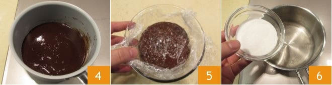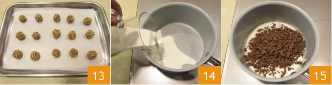 Legen Sie sie auf dasselbe Tablett, das mit einem Blatt Backpapier bedeckt ist 13, und bewahren Sie sie im Kühlschrank auf. Bereiten Sie nun den Überzug vor: Erhitzen Sie die Sahne in einem kleinen Topf 14, geben Sie dann die gehackte Gianduia-Schokolade hinzu 15 und rühren Sie mit einem Schneebesen, bis sie vollständig geschmolzen ist, dieses Mal sollte eine glattere Sauce entstehen. Übertragen Sie die Überzug-Sauce in eine kleine Schüssel.