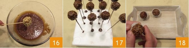 Nehmen Sie die Gianduia-Häppchen, stechen Sie sie mit einem Holzspieß auf, tauchen Sie sie in die Sauce, um sie vollständig zu überziehen 16, stecken Sie dann den Spieß in eine Styroporbasis 17, damit der Überzug leichter trocknet. Stellen Sie die Pralinen erneut für 30 Minuten in den Kühlschrank, damit der Überzug fest wird. Nach der angegebenen Zeit entfernen Sie die Spieße von den Pralinen und legen Sie sie in ein Papierförmchen 18, Ihre köstlichen Schokoladen- und Haselnusspralinen sind bereit, genossen zu werden.