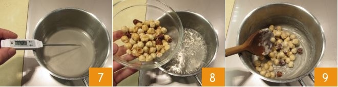 Überwachen Sie die Temperatur des Sirups mit einem Lebensmittelthermometer 7 und wenn er 116° erreicht hat, schalten Sie die Hitze aus und tauchen Sie die ganzen Haselnüsse ein 8, rühren Sie, bis die Mischung sandig aussieht 9. Schalten Sie dann die Hitze unter dem Topf wieder ein und lassen Sie den Zucker bei schwacher Hitze vollständig schmelzen, bis alles eine bernsteinfarbene Farbe annimmt.
