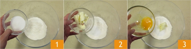 Um die Prateser Pfirsiche herzustellen, beginnen Sie mit dem Biga: Geben Sie das Mehl, den Zucker 1, die Butter 2 und das Ei 3 in eine Schüssel (oder eine Küchenmaschine mit Haken).