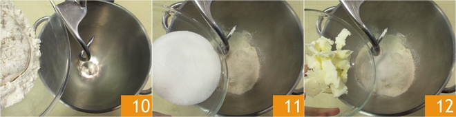 Geben Sie das Biga zusammen mit dem gesamten Mehl in die Schüssel einer Küchenmaschine mit Haken 10, fügen Sie dann den Zucker 11 und die Butter 12 hinzu.