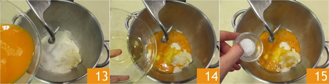 Fügen Sie auch fast alle Eier 13, den Honig 14 und das Salz 15 hinzu.