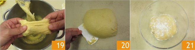 Überprüfen Sie, ob sich das Klebergerüst gebildet hat, indem Sie ein kleines Stück Teig nehmen und es zwischen den Fingern dehnen: Wenn es sich nicht reißt und elastisch und transparent erscheint, ist es bereit 19. Verwenden Sie einen Teigschaber, um den Teig auf die Arbeitsfläche zu übertragen 20, und führen Sie dann mit den Händen eine Pirouette durch. Legen Sie den Teig in eine Schüssel, bestäuben Sie ihn mit Mehl 21 und lassen Sie ihn etwa anderthalb Stunden gehen, abgedeckt mit Frischhaltefolie oder einem Tuch; das Volumen sollte sich um das 2- bis 2,5-fache erhöhen.