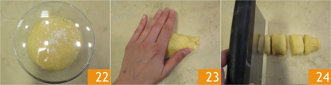 Nach der Gehzeit 22 den Teig auf eine leicht bemehlte Arbeitsfläche übertragen und in 5 Portionen von etwa 100 g aufteilen, dann gleichmäßige Stangen formen 23. Teilen Sie die Stangen in 8 gleiche Teile von etwa 12 g 24.