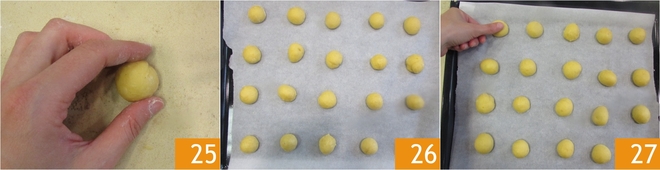 Formen Sie kleine Kugeln auf der Arbeitsfläche, ohne Mehl hinzuzufügen 25, und legen Sie sie dann auf ein mit Backpapier ausgelegtes Backblech, wobei Sie sie voneinander abstandhalten 26. Drücken Sie sie leicht flach, beginnend mit der ersten 27.