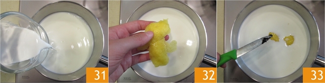 Um die Konditorcreme vorzubereiten, geben Sie die Milch und die Sahne in einen Topf 31, aromatisieren Sie dann mit 2-3 ganzen Stücken Zitronenschale 32 und den Samen einer halben Vanilleschote 33.