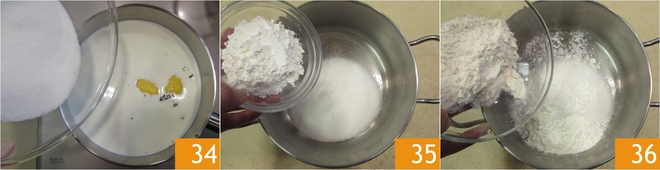Fügen Sie die Hälfte des Zuckers hinzu 34 und erhitzen Sie alles bei niedriger Flamme. In der Zwischenzeit geben Sie den restlichen Zucker in einen anderen Topf zusammen mit dem gesiebten Mehl 35 und der Maisstärke 36.