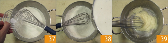 Fügen Sie das Salz hinzu 37 und mischen Sie mit einem Schneebesen. Wenn die Milch-Sahne-Mischung heiß ist, geben Sie einen kleinen Teil davon zu den Pulvern 38 und mischen Sie kräftig mit dem Schneebesen, um alle Klumpen zu entfernen 39. Bringen Sie in der Zwischenzeit den Topf wieder auf das Feuer, um ihn zum Sieden zu bringen.